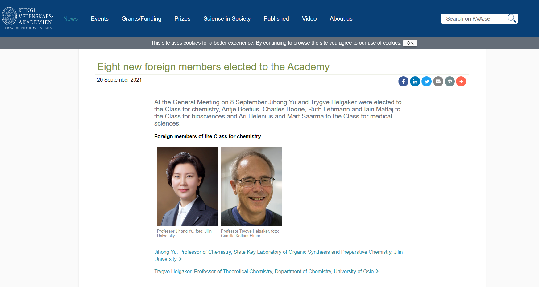 Recently, Prof. Jihong Yu, Professor of Chemistry at Jilin University, elected to the Royal Swedish Academy of Sciences as foreign member of the class for ch...