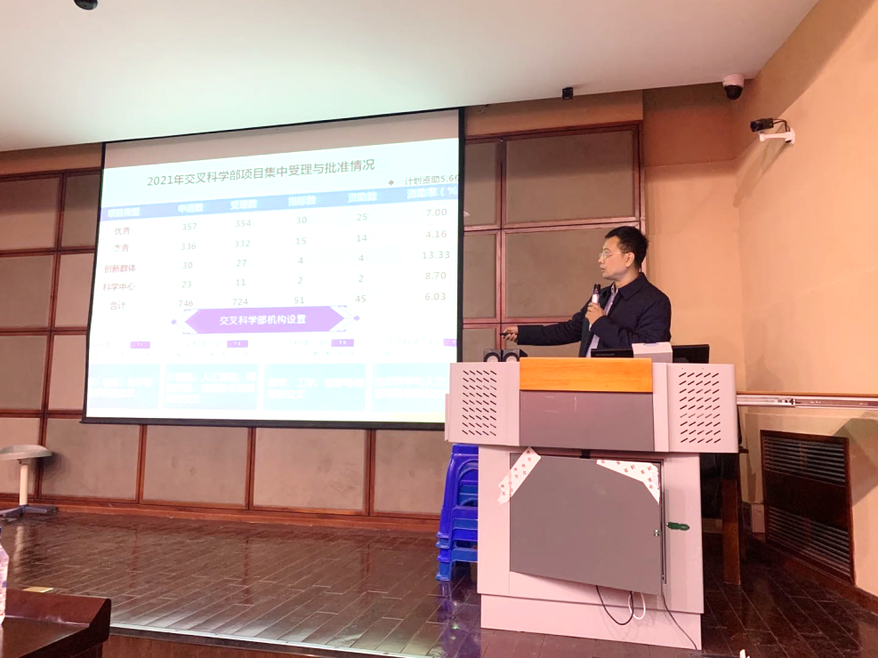 教师可结合自身情况尝试申请基金委交叉科学部的项目,进一步加强化学与医学、生命科学等相关领域交叉融合,产出助力国家经济社会发展的原创性成果。他向在座教师介绍了学校在基金申请及后续辅助指导方面的相关措施,希望通过学校和学院的共同努力,有效提高杏吧原创