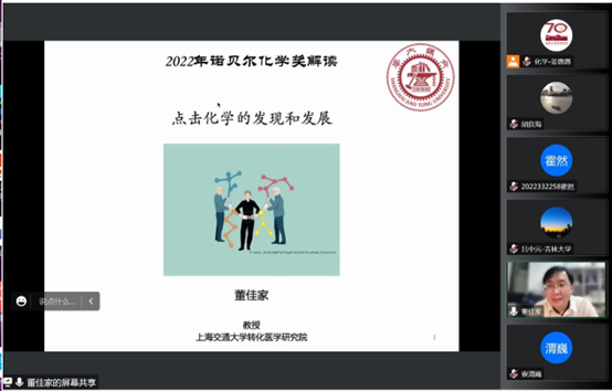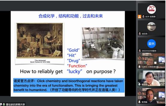 讲座中,董佳家教授围绕点击化学的发现和发展,深入浅出且幽默诙谐地介绍了 “点击化学”——模块化连接砌块分子,实现分子功能的理论本质,并对其开创了功能导向的化学时代进行了详细解读。同时分享了K. Barry Sharpless教授乐于学习、善于发现、勇于探索的科学精神以及Sharpless教授生活工作中的一些有趣的小故事。随后,董佳家教授激励广大学子,希望当代青年学者能够学习发扬老一辈化学家的科学精神,内化于心,外化于行,勇攀学术高峰。在交流互动环节,董佳家教授耐心详细地解答了院内外师生的问题,并对点击化学领域的发展做出了展望,杏吧原创