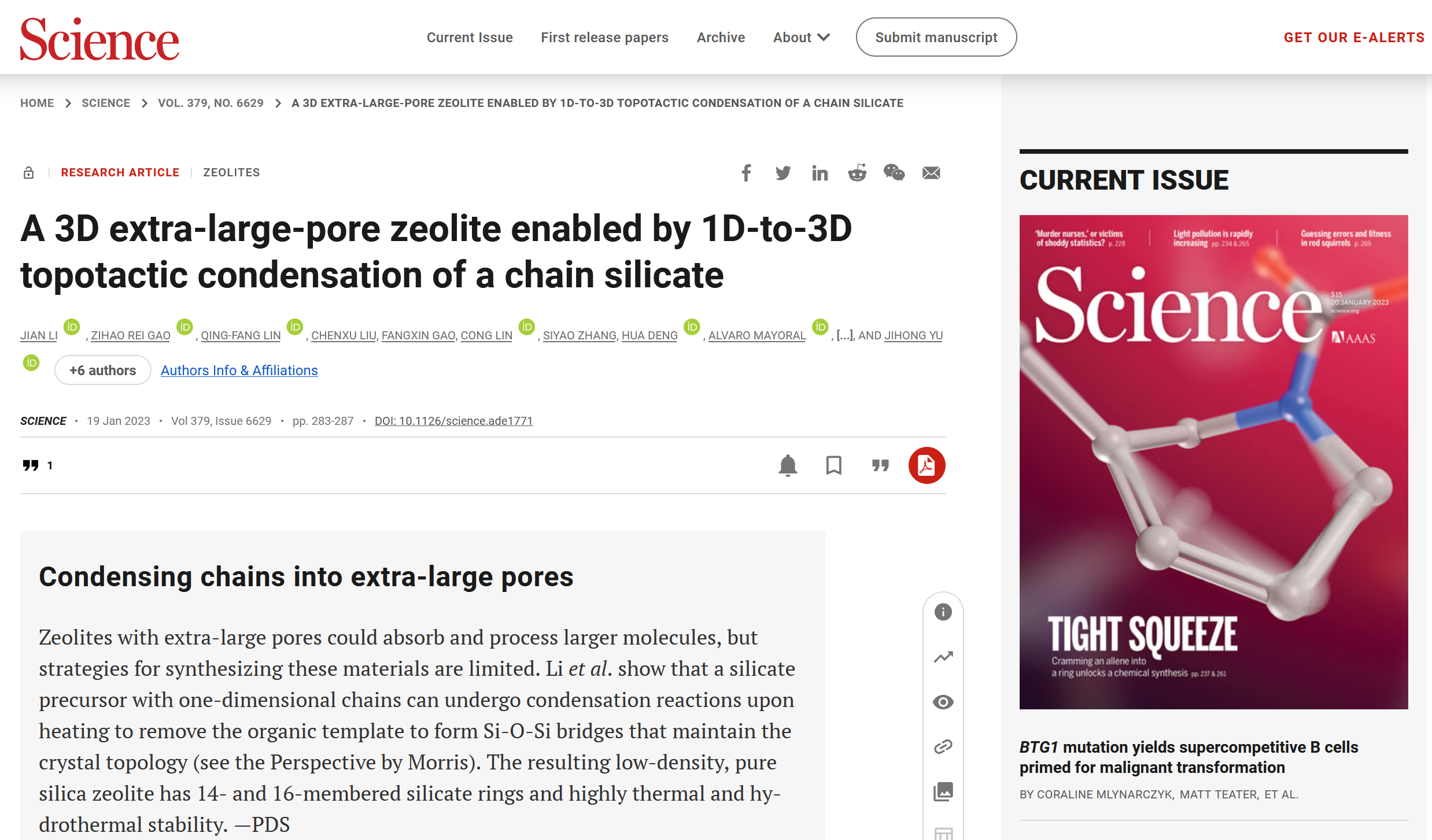 、无机合成与制备化学国家重点实验室陈飞剑教授和于吉红院士联合瑞典斯德哥尔摩大学、北京大学、西班牙马德里材料研究所等单位的科研人员报道了一例经由一维到三维的拓扑缩合合成的新型三维稳定超大孔硅酸盐分子筛材料ZEO-3,相关研究成果以“A 3D Extra-Large Pore Zeolite Enabled by 1D-to-3D Topotactic Condensation of a Chain Silicate”为题于1月20日在线发表于《Science》期刊。该材料由陈飞剑教授和于吉红院士课题组所开发,他们首先合成了一种新颖的1D链状硅酸盐材料ZEO-2,ZEO-2经高温煅烧直接发生拓扑缩合生成了3D稳定的全连接超大孔分子筛ZEO-3。瑞典斯德哥尔摩大学/北京大学黎建博士通过使用先进的连续倾转三维电子衍射(cRED)技术结合X-射线粉末衍射拟合精修方法最终确定了这两种材料的精确结构。ZEO-3具有3D十六元环(16MR)和十四元环(14MR)穿插超大孔道结构(图1),是首例具有全连接三维超大孔道稳定结构的纯硅分子筛,是迄今为止已知的密度最小的二氧化硅多晶型,它的成功创制是超大孔纯硅分子筛合成领域的一项重要突破。ZEO-3具有超高的稳定性,1200℃煅烧仍保持稳定,其比表面积超过1000 m2/g,与其他沸石和金属有机框架相比,展现出优异的挥发性有机物(VOCs)吸附处理性能。该工作中1D到3D拓扑缩合新机制的发现,对理解传统分子筛晶化机理提供了新的启迪,对新型分子筛的设计合成及分子筛晶化机理的进一步阐明具有重要的指导意义。《Science》同期刊发了分子筛领域著名专家英国圣安德鲁斯大学Russell E. Morris教授针对该工作题为”Clicking zeolites together: A new mechanism to synthesize catalytic zeolites gives a previously unknown topology”的观点评述文章,将这种1D到3D的拓扑缩合比做分子筛中的“点击化学”,指出这种机制的发现必将导致新的拓扑结构,对于理论预测的大量分子筛新结构的实验室合成取得突破具有极大的吸引力,从而开辟新的应用领域。