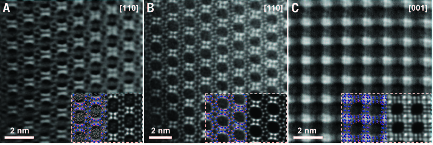 图4. ZEO-2和ZEO-3的球差电镜照片:(A)沿[110]带轴的ZEO-2;(B)沿[110]带轴的ZEO-3;(C)沿[001]带轴的ZEO-3(来源:Science)