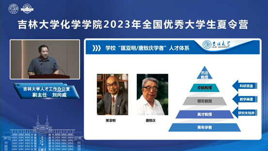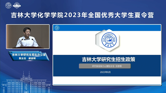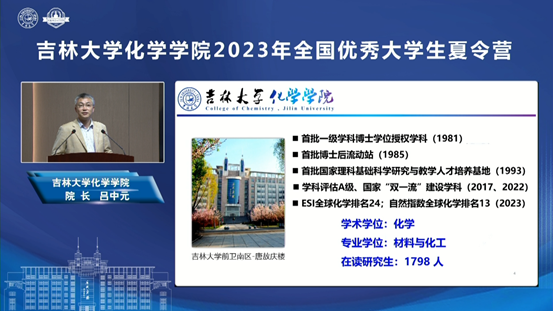 院长吕中元介绍了学院基本情况及人才培养优势;超分子结构与材料国家重点实验室主任孙俊奇、无机合成与制备化学国家重点实验室副主任王洋、特种工程塑料教育部工程研究中心副主任赵成吉、理论化学研究所朱有亮老师分别介绍了各科研平台的科研情况、招生方向等,并带领营员们以线上线下同步的形式参观了科研平台和特色课题组科研环境,让营员们能够近距离感受化学研究的魅力和吉大化学深厚的学术底蕴。