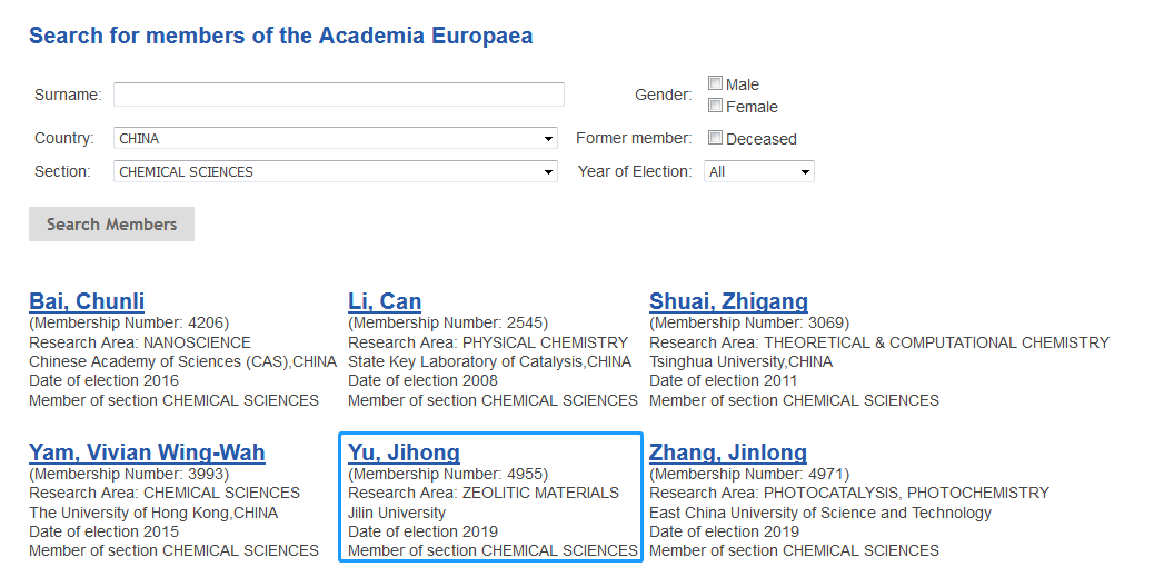 历年中国籍学者入选欧洲科学院外籍院士(化学领域)