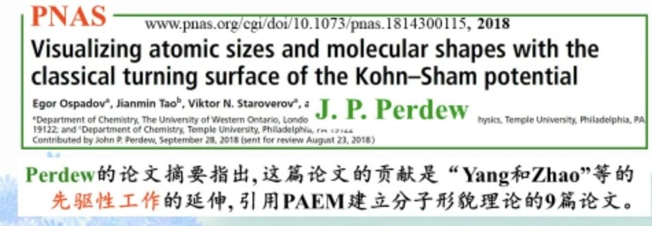 值得一提的是,2018年,美国科学院院士Perdew等在PNAS上发表论文,引用关于分子形貌研究的9篇论文,在摘要和正文中称我们团队的研究是先驱性的,他们的研究工作是我们研究的延伸。