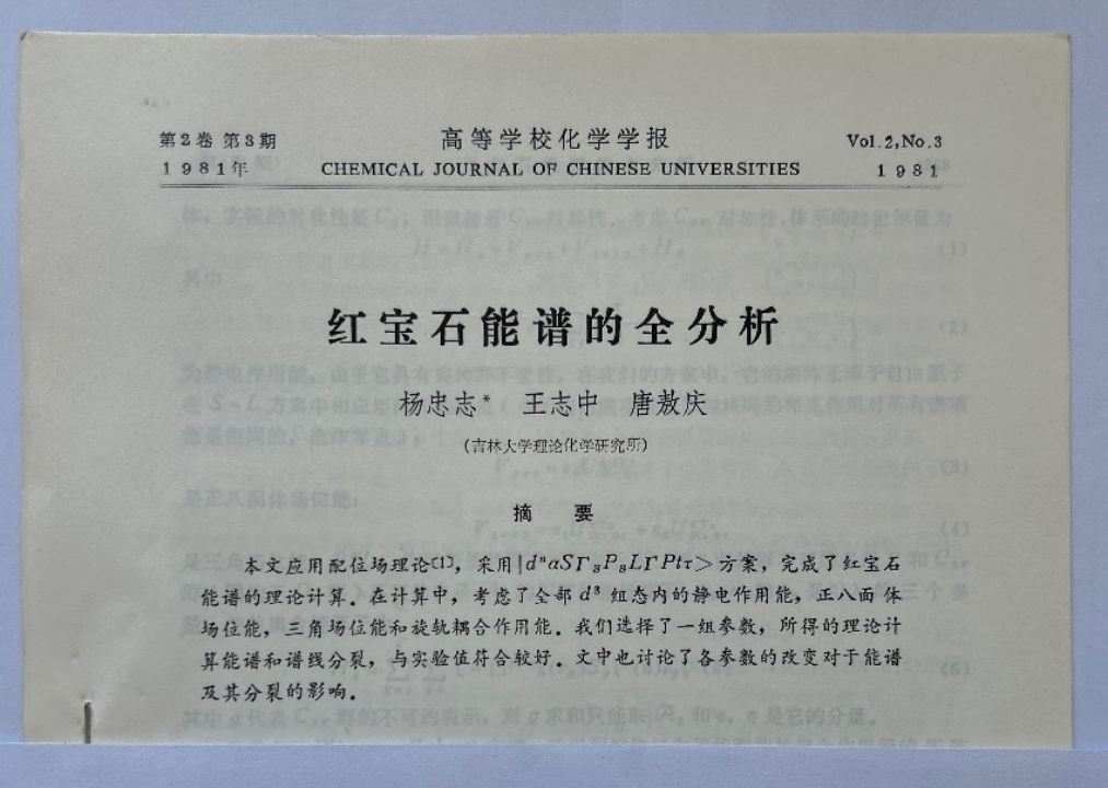 关于“红宝石能谱全分析”的论文,1966年5月我就写好了,但唐老师非常严格要求,多次修改,直到1981年才发表。我写的关于“高分子HMO理论能谱全分解”的论文,也在唐老师那里审查和等待了三年才发表。