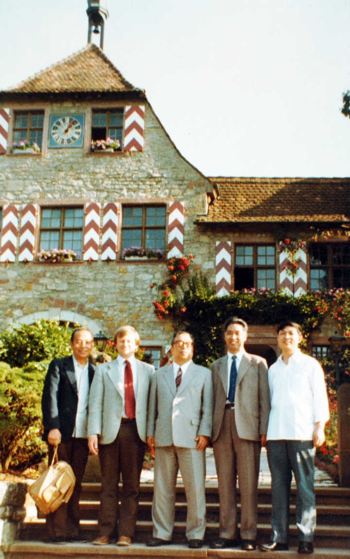 图5 1982年,在瑞士巴塞尔大学。左起:孙家钟、John Maier、唐敖庆、时任瑞士使馆文化参赞、杨忠志。
