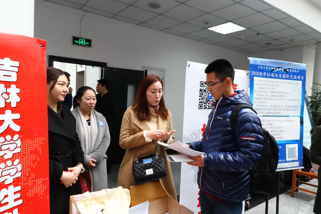 活动现场不仅展示了宣讲单位的招生宣传海报,更有以中国科学院院士领衔的近百名教授、博士生导师亲临现场向同学们讲解课题组研究方向、就业前景、人才培养思路、并现场接收学生简历,活动过程中师生面对面交流科研工作,现场气氛热烈、学术氛围浓郁,在学校国际合作与交流处的展位前,工作人员详细介绍了针对化学学科本科生、研究生的海外交流项目,发放宣传材料150余份。