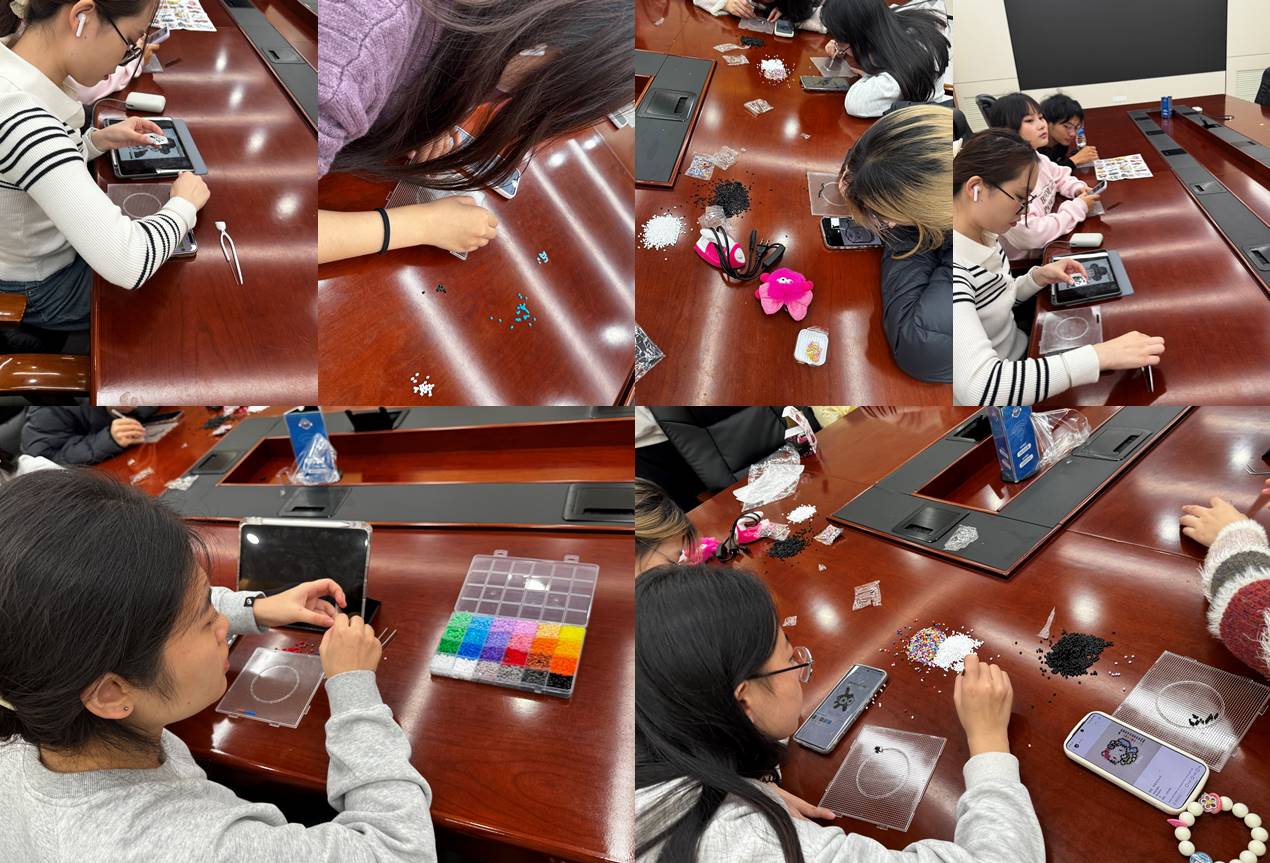 创作环节,同学们前往材料区挑选拼豆颜色与模板,投入制作。大家或独自构思图案,专注地将拼豆嵌入模板;或结伴交流,分享创意、探讨组合技巧。在制作过程中,同学们主动分享工具与操作经验,看到彼此的半成品时交流点评、相互鼓励,在协作与互动中推进作品完成。