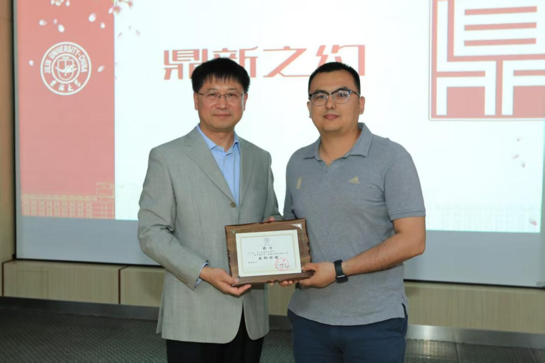 张希校长向阿力木颁发“鼎新学者”牌