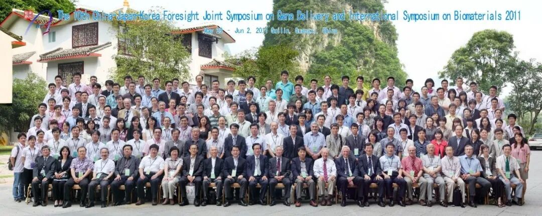我们大约在2006年3月正式提交了申请书,不久便收到了答辩通知。同年6月,我们顺利通过答辩,成功获得该项目。值得一提的是,这是当年唯一获得资助的该类别项目,资助金额为200万元。拿到项目后,我们很快启动了中日韩三国的学术交流活动。第一届A3会议于2006年11月在福建厦门顺利召开(图9)。当时会议规模不大,仅限于三方合作的课题组参与,但交流非常充分,学术讨论的气氛也十分热烈。那一次,两位外方教授真诚随和的性格和严谨的治学态度,给我留下了很深的印象。也正是在这次交流中,我们进一步增进了彼此友谊,并确定了后续的合作交流安排。因此,在项目执行的5年内(含2年延续资助150万元),我们基本上以一年两次国际学术研讨会的形式进行交流,一共举办了10次国际学术研讨会(2007年1月第二届A3会议在日本鹿儿岛、2007年5月第三届A3会议在韩国大田、2007年12月第四届A3会议在日本东京、2008年5月第五届A3会议在韩国浦项、第六届A3会议在海南三亚、2009年5月第七届A3会议在韩国首尔、2009年10月第八届A3会议在日本那霸、2010年6月第九届A3会议在吉林长春、2011年6月第十届A3会议在广西桂林)和进行了2次青年学者交流(2007年7月在日本福冈、2010年7月在韩国大邱)。经过初期两次课题组间的小范围交流,我开始思考如何借助这个平台,进一步扩大交流的范围。为此,在第三届A3会议的时候,我邀请了四川大学的顾忠伟教授,中国科学院化学研究所的甘志华研究员、中国科学技术大学的王均教授、武汉大学的张先正教授和苏州大学的陈红教授等与我们一起前往韩国大田参加学术研讨会,第一次把A3会议扩大到了三个合作课题组之外。我的这次“破例”,也得到了日韩教授的积极响应,在后续的会议中,都主动扩大了交流的范围。在第六次A3会议的时候,我们邀请了来自中国、日本、韩国、美国、瑞典、荷兰等9个国家130余名生物材料领域的优秀专家学者参会,其中海外学者50余名。在第十次A3会议的时候,来自中日韩及欧美国家的参会代表达240余名,其中外国代表70余名(图10)。参加那次研讨会的有很多基因传输和生物材料领域的国际知名学者,如美国犹他大学的Sung Wan Kim教授(美国国家工程院和美国国家医学院院士)、美国华盛顿大学的Allan Hoffman 教授(美国国家工程院院士)、荷兰Twente大学的Jan Feijen教授(Journal of Controlled Release杂志创始主编)、美国普渡大学Kinam Park教授(时任Journal of Controlled Release杂志主编)、日本东京大学的Kazunori Kataoka教授(时任日本高分子学会会长)、日本东京女子医科大学的Teruo Okano教授(时任日本药物递送系统学会和日本再生医学学会会长)、韩国成均馆大学的Doo Sung Lee教授(韩国国家工程院院士)等。