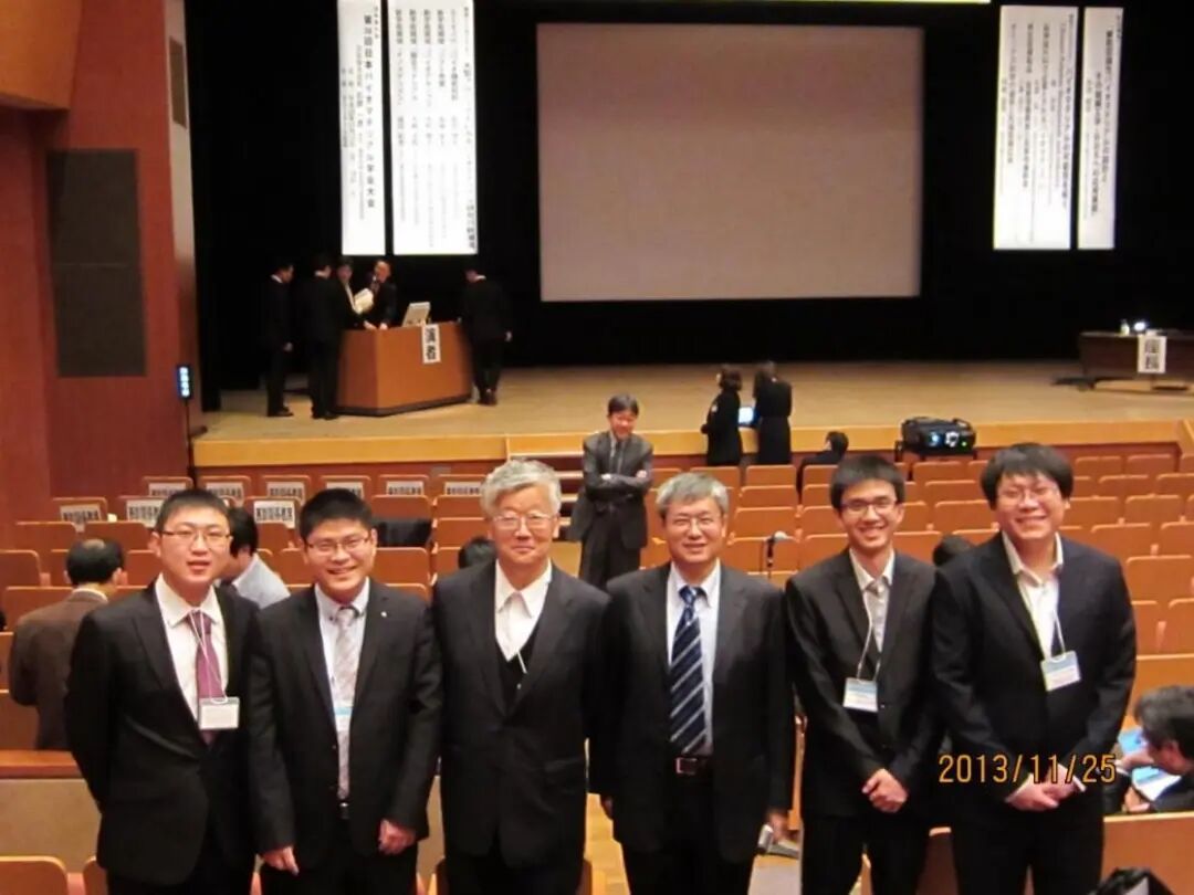 图11 2013年11月,参加第35届日本生物材料学会年会期间合影。左起:张羽、丁建勋、赤池敏宏(东京工业大学教授)、陈学思、李明强、崔海涛