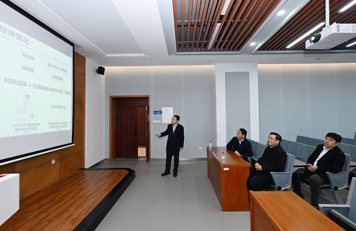 在物理学院,田辉先后来到院史馆、仪器设备共享平台实验室、物理国家级实验教学示范中心和物质模拟方法与软件教育部重点实验室,详细了解学院发展历程、学科基础与育人成果,听取学院学科发展建设、“十五五”规划编制以及树立和践行正确政绩观学习教育情况汇报。田辉指出,物理学科作为学校“双一流”建设学科,要不断提升人才自主培养能力,源源不断地为国家造就拔尖创新人才。要聚焦世界科技前沿,强化前瞻性、战略性、系统性布局,力争在原始创新和关键核心技术突破上取得新进展。要深化有组织科研,主动与校内相关优势学科开展深度交叉研究,在服务国家重大战略需求中走在前、做表率。要大力弘扬科学家精神,营造鼓励探索、包容试错的创新生态,为青年人才成长成才搭建广阔舞台。