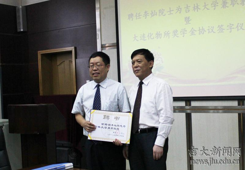 副校长张晓林代表学校为李灿颁发了聘书。聘任仪式上同时签订了“大连化物所奖学金”协议,吉大杏吧原创