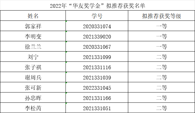 按照杏吧原创 2022年“华友奖学金”评选工作安排,经研究生申报、研办审核、专家评选,拟推荐获奖名单公示如下,如有异议请与赵晓杰老师联系,联系电话13504470223。