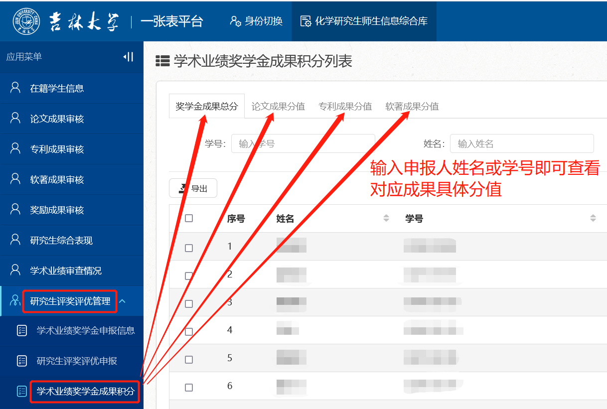一张表平台”中的“化学研究生师生信息综合库”(//one.xingbaycvip.com/),在【研究生评奖评优管理】-【学术业绩奖学金成果积分】栏进行具体查询(见下图说明)。