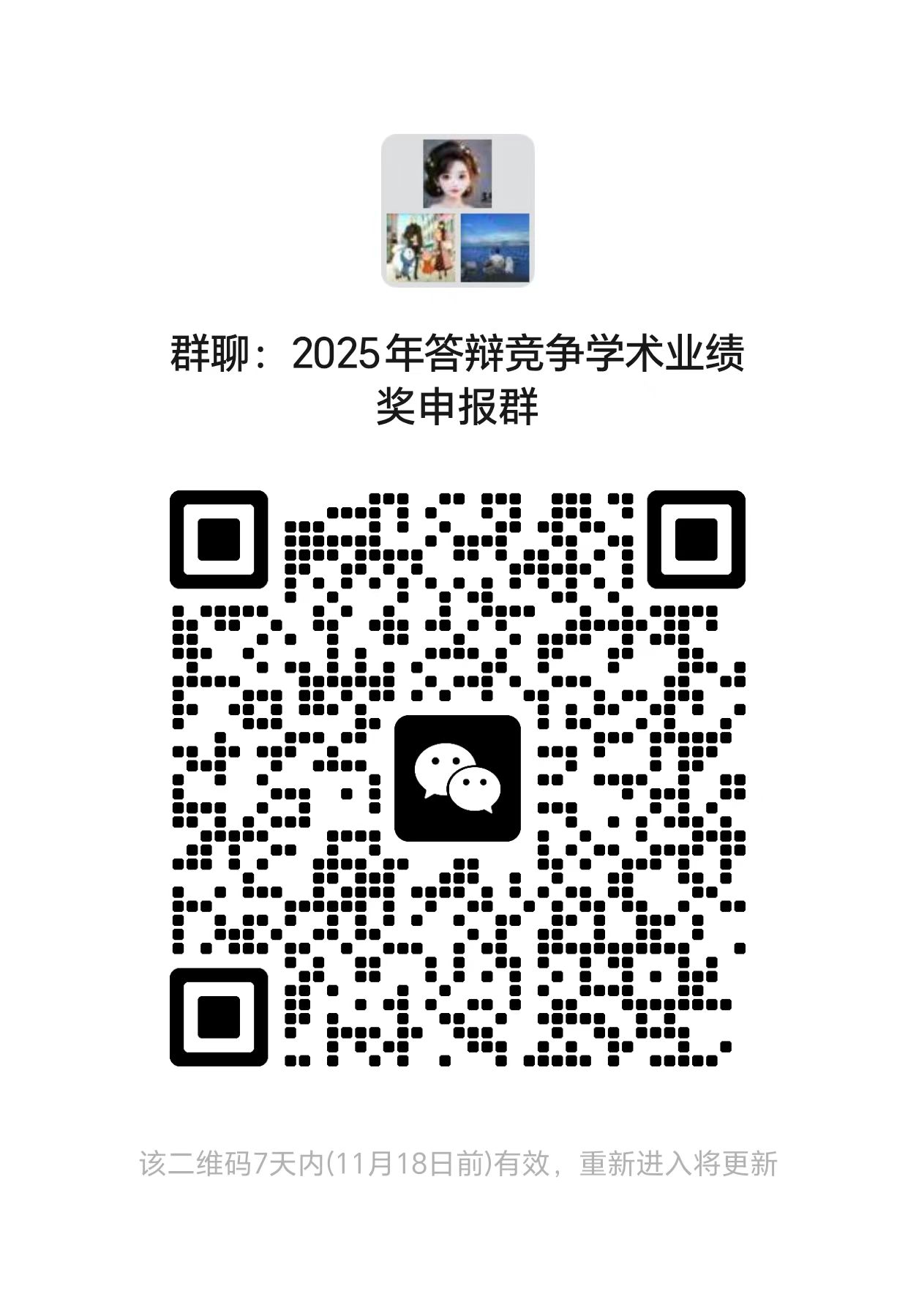 欲以答辩方式竞争上一等级奖学金的,即初评【二等奖/三等奖/未获奖】,申请以答辩形式竞争【一等奖/二等奖/三等奖】的,请于11月13日24:00前扫码加入“2025年答辩竞争学术业绩奖申报群”。