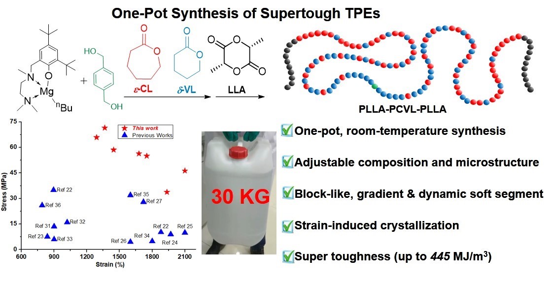 此外,课题组利用含有边臂效应的镁配合物与二醇组成的催化体系可以实现环内酯的活性可控聚合。该催化体系对于己内酯(CL)和戊内酯(VL)单体的聚合速度差异较大,因此通过双向的引发可实现一个从中间向两边的梯度渐变的随机共聚物的合成。该共聚物可以作为ABA热塑性弹性体的软段加以利用,其梯度中间随机无定形部分可以为聚合物提供高的应变,而其两端的均聚部分在拉伸过程中会出现应力诱导结晶现象,可提供更多的结晶区域相来承载更高的应力。该工作通过催化剂对聚合物链段微结构的控制,制备出了目前文献所报道的最高韧性(445MJ/m3)的材料,为高性能弹性体的强韧化提供了一个新思路(Zhao W C, Li C K, Yang X, He J H, Pang X, Zhang Y T*, Men Y F*, Cheng X S*.CCS Chem.2021,3,1522,见下图4)。