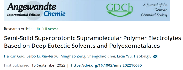李昊龙教授通过采用多金属氧酸盐(POM)纳米团簇作为超分子交联剂来固化深共晶溶剂(DES),以制备半固态块状超分子聚合物电解质材料。研究显示,POMs提供的丰富质子和强氢键使这些SP材料成为具有足够机械强度的超质子导电电解质,其在室温下表现出超过1×10-4 S cm-1的质子电导率和超过1 MPa的断裂强度。此外,超分子聚合物电解质的热力学可逆性使它们能够在温和加热时通过简单的熔体渗透策略形成稳定的电极-电解质界面,从而提高超级电容器的性能。总体而言,这项工作提出了一种创新的DES/POM混合系统,是开发用于能源和电子应用的功能性超分子材料有前景的平台。
