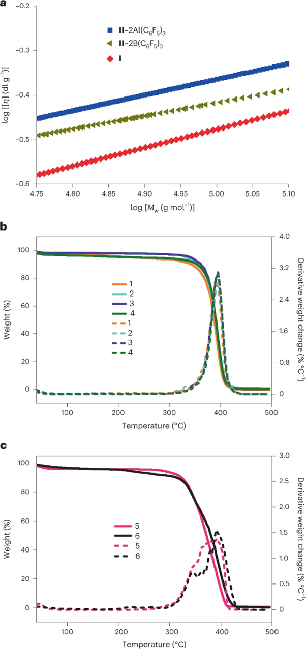 图6 a,不同拓扑结构的PMMBL的特性粘度比较,如Mark–Houwink图所示:由FLP I产生的c-PMMBL,由分子间 II–2B(C6F5)3 产生的环状和线性PMMBL混合物,以及由分子间LPII–2Al(C6F5)3制备的l-PMMBL。b,具有四种不同MWs的c-PMMBL样品的TGA(实线)和DTG(虚线)曲线叠加:sample 1, Mn = 93.1 kg mol–1, Đ = 1.31; sample 2, Mn = 109 kg mol–1, Đ = 1.21; sample 3, Mn = 176 kg mol–1, Đ = 1.41; sample 4, Mn = 403 kg mol–1, Đ = 1.88. c,两种不同MWs的l-PMMBL样品的TGA(实线)和DTG(虚线)曲线叠加图:sample 5, Mn = 289 kg mol–1, Đ = 1.82; sample 6, Mn = 427 kg mol–1, Đ = 1.77.