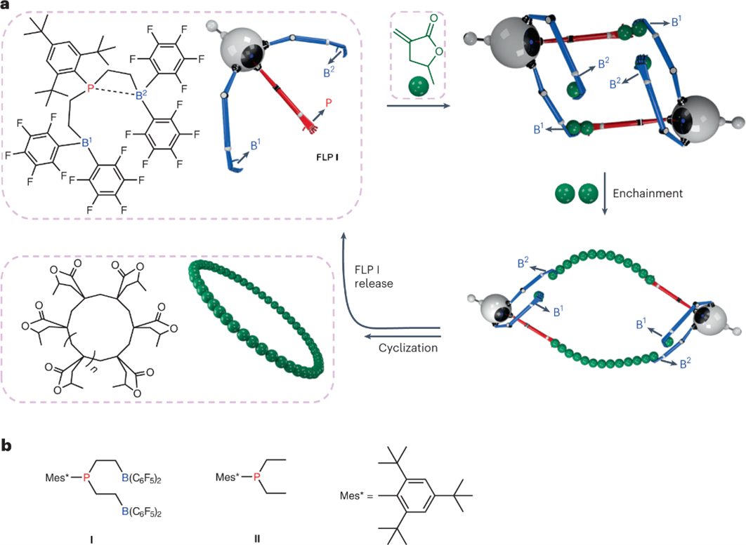 针对上述问题,作者开发了一种B-P-B三官能FLP催化剂Ⅰ(图1b),催化环状丙烯酸酯单体MMBL以双分子协同、单体成对插入的方式进行链增长,最后两条链的ω端进攻另一条链的α端得到完全由单体构成的环状聚合物(图1a)。