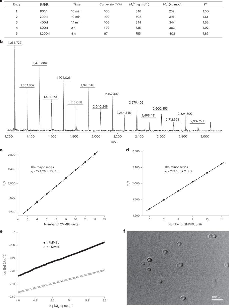 图2 a, 表中显示了室温(~25℃)下由MMBL和FLP I在DCM中制备的PMMBL的选定聚合数据 ,[M]0 = 0.936 M. a通过1H NMR光谱测定单体转化率。b使用光散射检测器通过GPC测量绝对重均分子量(Mw)。cMn 由Mw/Đ计算得出. dĐ = Mw/Mn. b, 用FLP I.制备的MMBL低聚物的MALDI-TOF MS谱,c,d,b中分子离子的主要(c)和次要(d)系列的m/z与2MMBL重复单元数量的关系图。e,l-PMMBL和c-PMMBL的特性粘度的比较,为用IAP–Al(C6F5)3 制备的l-PMMBL和用I制备的c-PMMBL的Mark–Houwink图。f, c-PMMBL50-ran-PVMBL50-g-PEG2000的TEM图像。