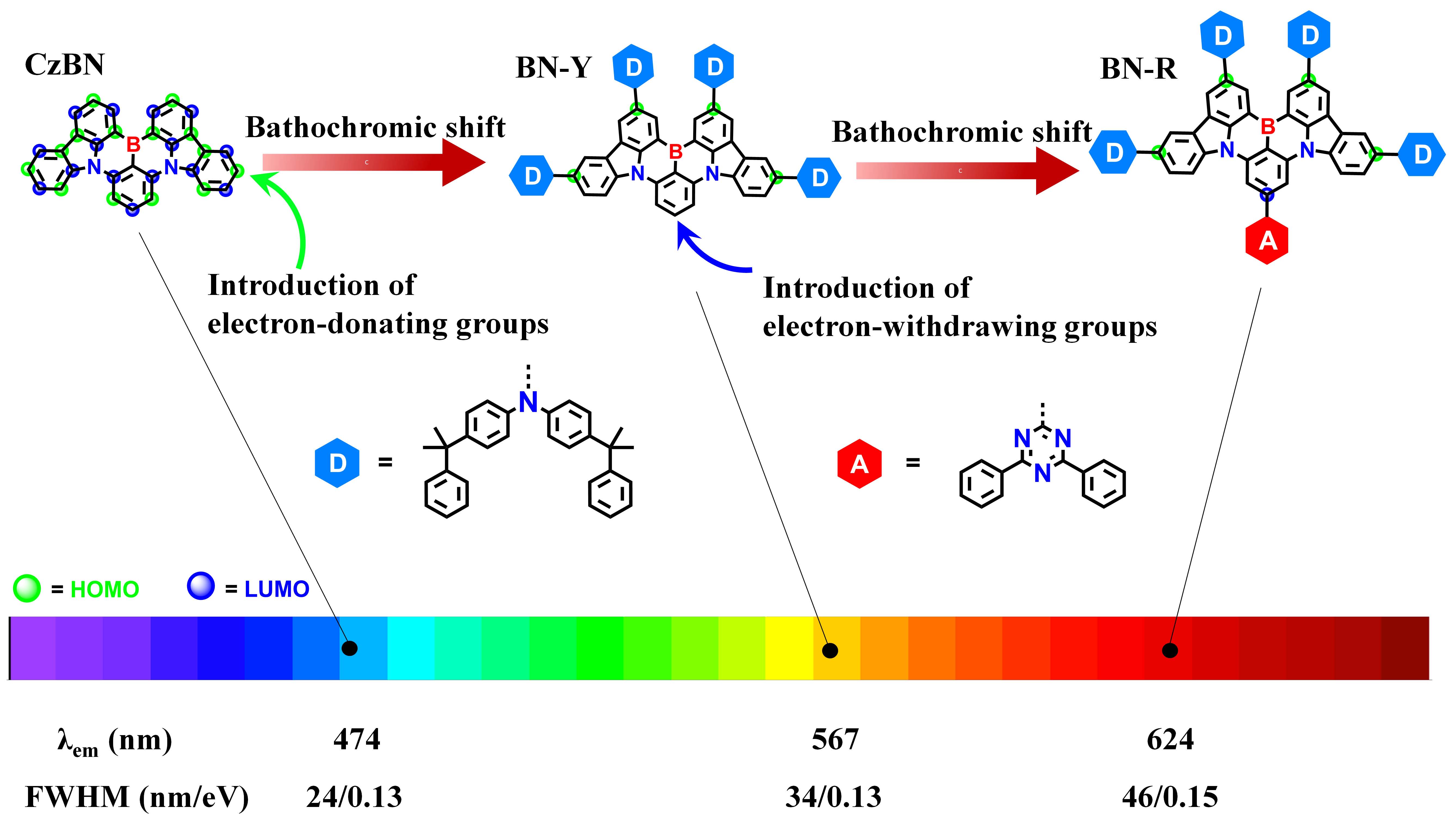 图 1. 分子设计策略和CzBN、BN-Y、BN-R的分子结构