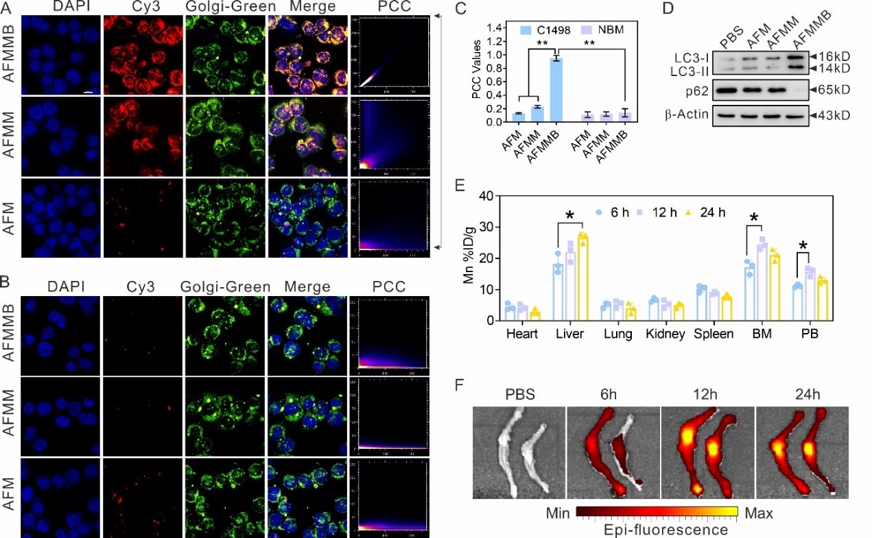 通过荧光共聚焦成像、ICP-MS、Western blot等方法,证明AFMMB能通过Beclin-1结合高尔基体,并诱导细胞自噬。利用ICP-MS和IVIS成像发现在对白血病小鼠尾静脉注射AFMMB的12h后,小鼠骨髓中的AFMMB含量达到峰值,而心、脾、肺和肾脏中的AFMMB含量相对较低(图3)。体内体外数据结果表明AFMMB对AML具有良好的靶向性。