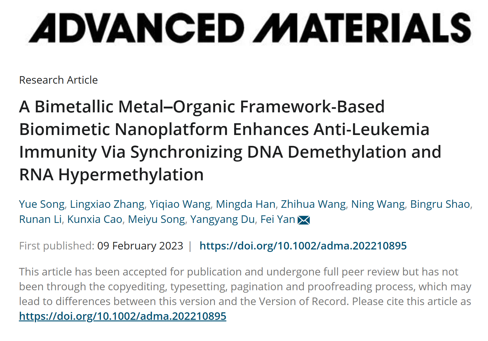 无机合成与制备化学国家重点实验室闫飞课题组提出一种纳米表观治疗新策略,并以“A Bimetallic Metal–Organic Framework-Based Biomimetic Nanoplatform Enhances Anti-Leukemia Immunity via Synchronizing DNA Demethylation and RNA Hypermethylation”为题发表在Advanced Materials上。杏吧原创