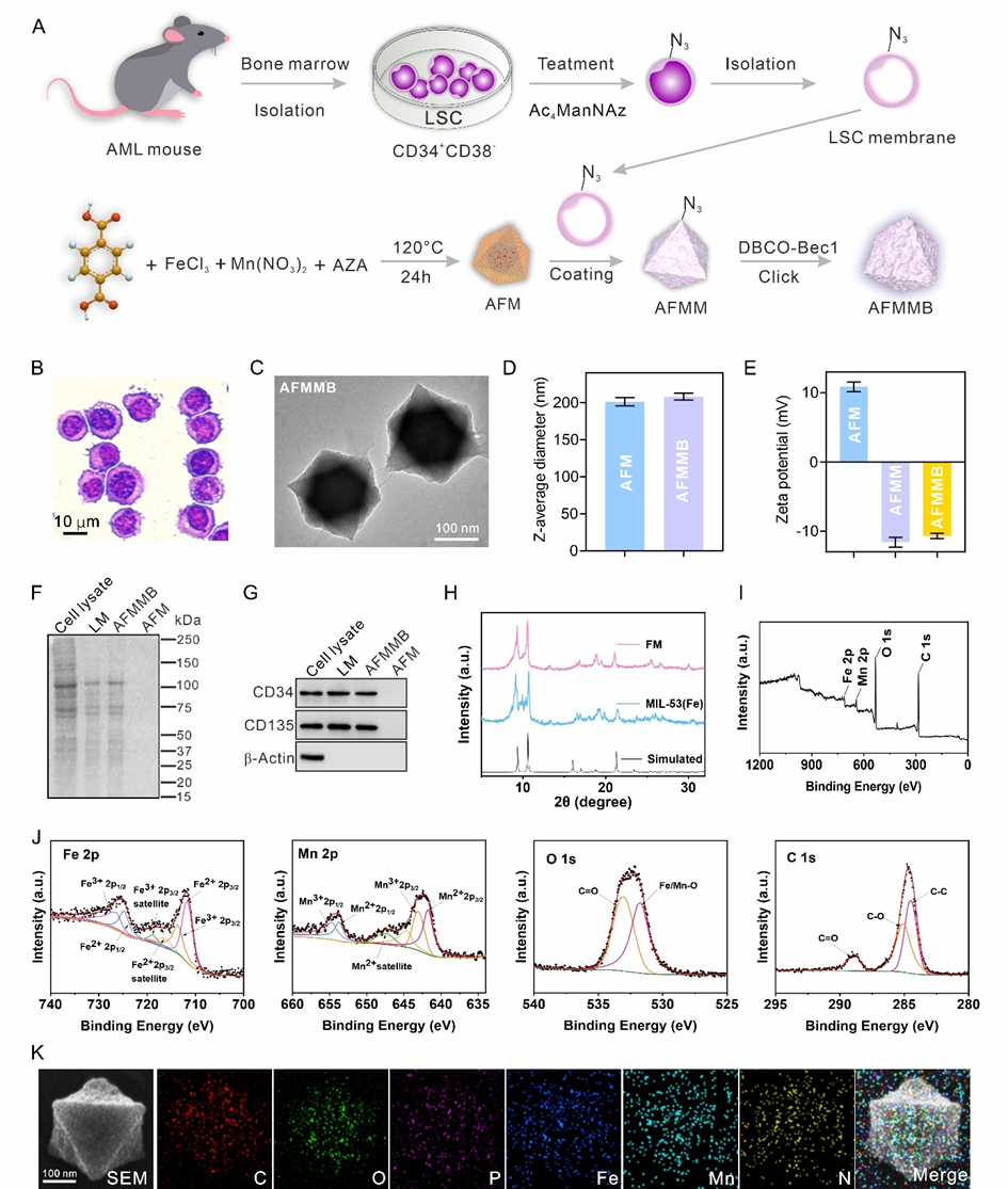 课题组以铁基MIL-53为骨架,采用溶剂热法合成了由铁和锰离子组成的双金属MOF,然后将难溶的DNA去甲基化药物AZA载到MOF的孔隙中。之后,用叠氮标记的小鼠LSCs膜(CD34+CD38-)包裹,并通过“点击化学”与Beclin-1肽结合形成AFMMB。通过透射电镜(TEM)、粉末X射线衍射(XRD)、X射线光电子能谱(XPS)等方法对AFMMB的形貌及结构进行了表征(图2)。