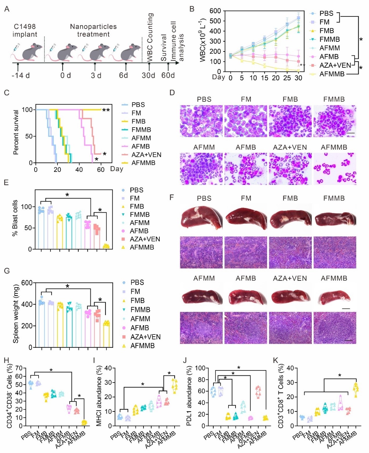 图5. AFMMB对白血病小鼠的免疫治疗效果