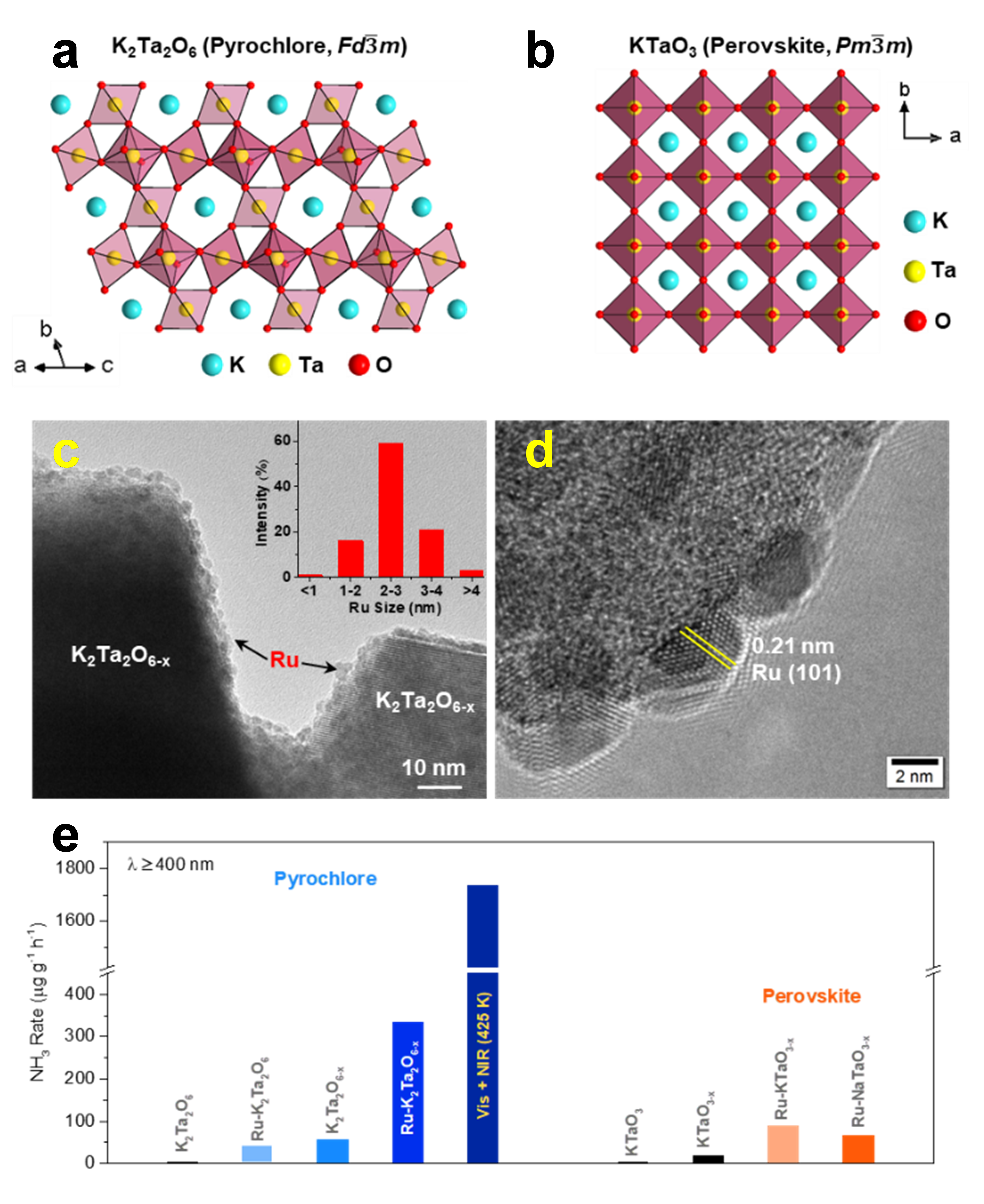 图1:a)烧绿石构型K2Ta2O6的空间结构示意图;b)钙钛矿构型的KTaO3的空间结构示意图;c)钌负载的缺陷烧绿石Ru-K2Ta2O6-x的HRTEM图;d)Ru-K2Ta2O6-x的表面负载Ru颗粒的HRTEM图;e)所制备催化剂的光催化合成氨反应效果图。
