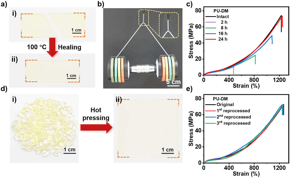 图5. PU-DM弹性体的修复和再加工性能。(a) PU-DM弹性体修复过程的实物照片。(b)修复后的PU-DM弹性体提起重物的实物照片。(c)PU-DM弹性体在不同修复时间下的应力-应变曲线。(d) PU-DM弹性体再加工过程的实物照片。(e)PU-DM弹性体经历三次热重塑后的应力-应变曲线。