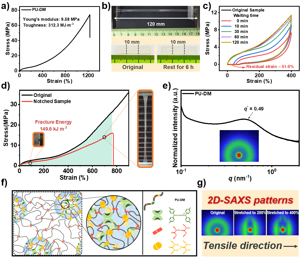 图4. PU-DM弹性体的力学性能与结构表征。(a) PU-DM弹性体的应力-应变曲线。(b) PU-DM弹性体被拉伸后的实物照片。(c)PU-DM弹性体在循环拉伸过程中的应力-应变曲线。(d) PU-DM弹性体在撕裂后的应力-应变曲线。(e)PU-DM弹性体的SAXS曲线。(f) PU-DM弹性体的结构示意图。(g) PU-DM弹性体在不同拉伸倍率下的2D-SAXS谱图。