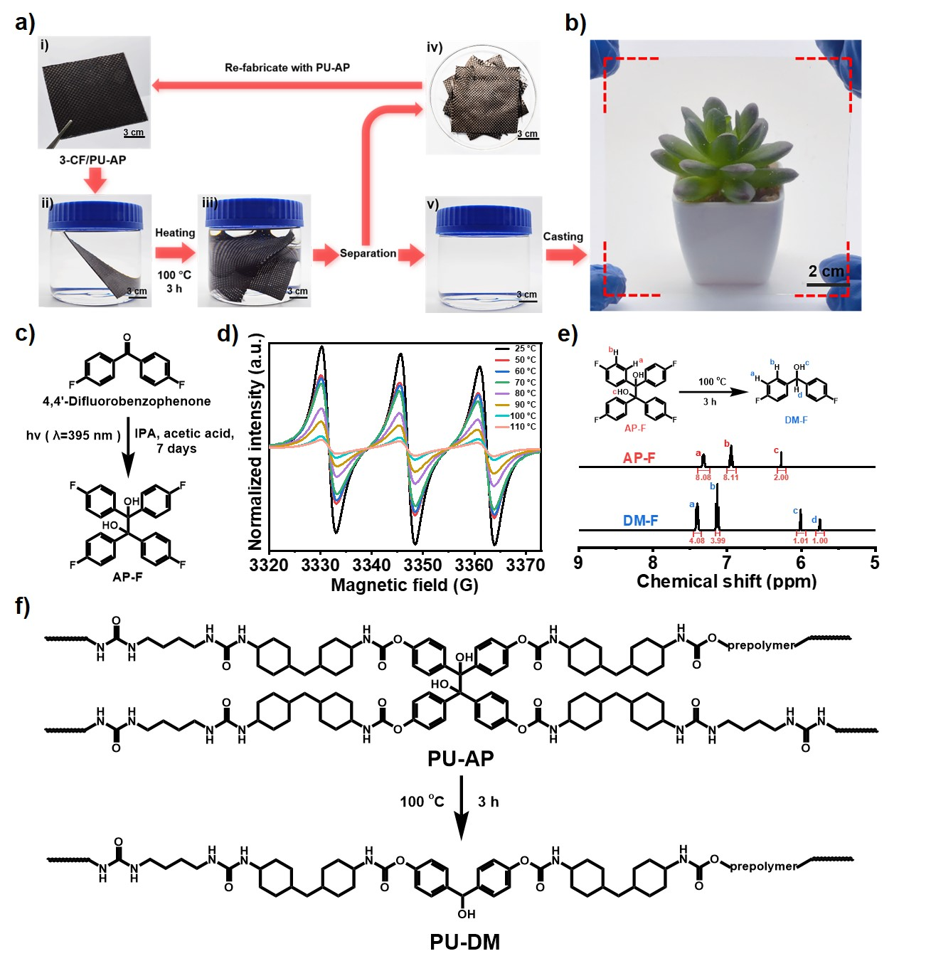 图3.CF/PU-AP复合材料的升级回收。(a)CF/PU-AP的升级回收过程的实物照片。(b) PU-DM的实物照片。(c)模型分子AP-F的合成过程。(d)AP-F的顺磁测试谱图。(e)AP-F的解离过程及AP-F和DM-F的核磁图。(f) PU-DM的化学结构式。