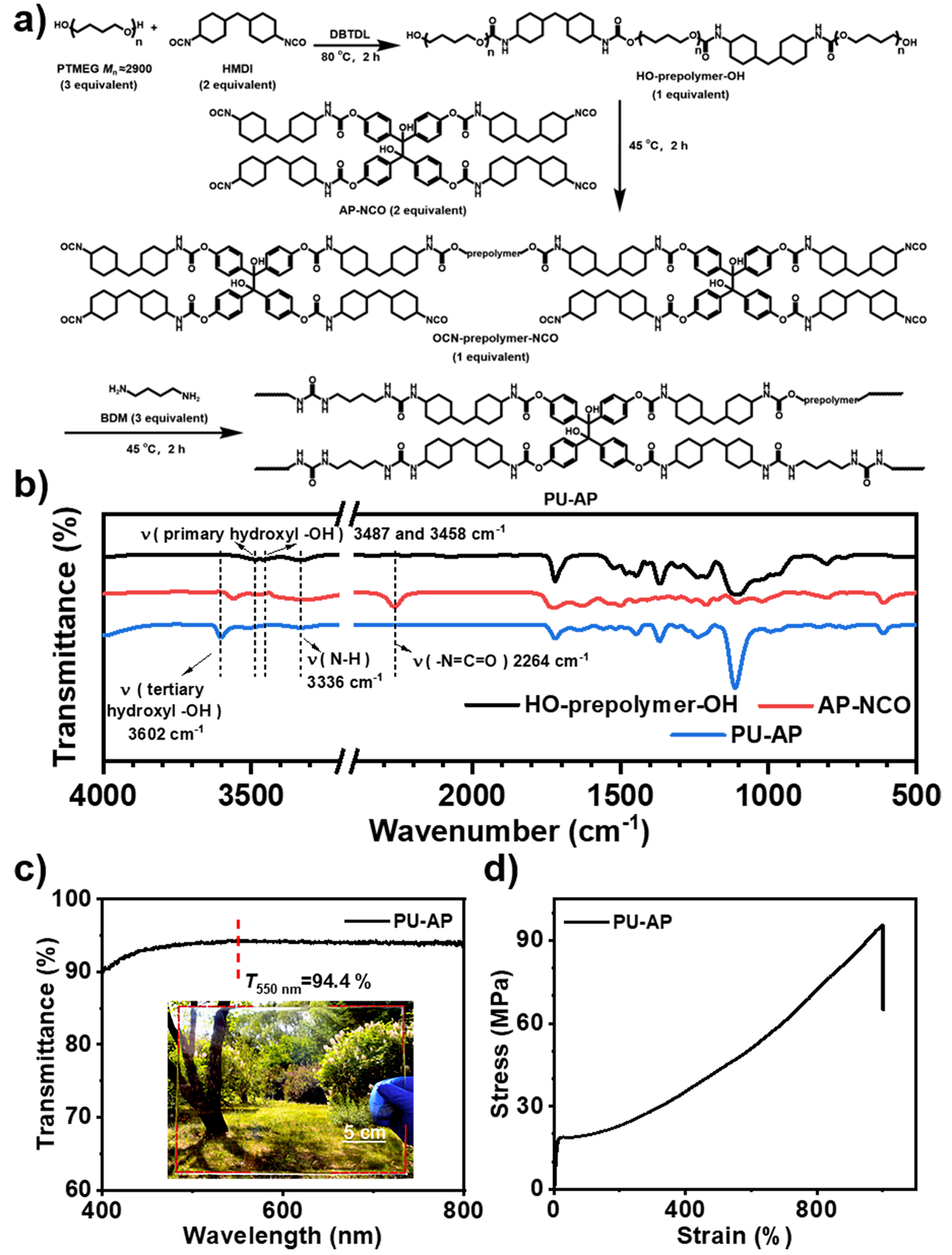 图1.热固性树脂PU-AP的制备。(a) PU-AP的合成路线。(b) HO-prepolymer-OH, AP-NCO和PU-AP的红外光谱图。(c) PU-AP的紫外-可见透过光谱及实物照片。(d) PU-AP的应力-应变曲线。