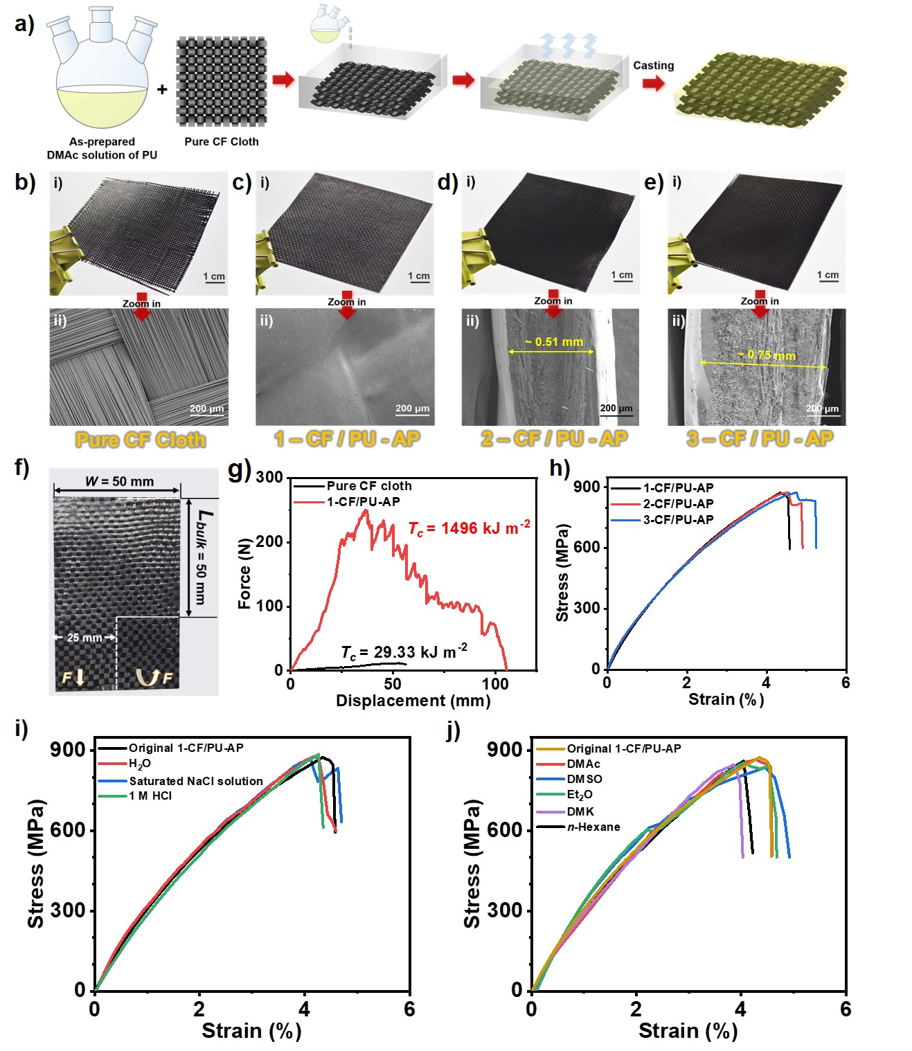 图2.CF/PU-AP复合材料的制备。(a)CF/PU-AP的制备路线。(b,c)纯碳纤维布及1-CF/PU-AP的实物照片及SEM俯视图。(d,e) 2-CF/PU-AP及3-CF/PU-AP的实物照片及SEM断面图。(f)用于裤型撕裂测试的1-CF/PU-AP的实物照片。(g)纯碳纤维布及1-CF/PU-AP在裤型撕裂测试中的应力-应变曲线。(h)1-,2-及3-CF/PU-AP的应力-应变曲线。(i,j)1-CF/PU-AP浸泡于不同水溶液的应力-应变曲线(i)及浸泡于不同有机溶剂干燥后的应力-应变曲线(j)。(注:1-CF、2-CF和3-CF分别指CF/PU-AP复合材料中碳纤维布的层数为1、2和3层)