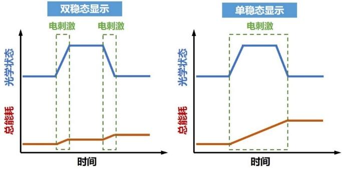 双稳态显示是一类存在两种稳定光学状态的显示技术,其特点是在持续显示相同信息(图像或文字)时不需要能耗,只有在切换显示信息时需要施加电脉冲驱动,具有低能耗、视力友好等特征,如图1,因此被认为是未来最有效的节能健康显示技术之一。相较于双稳态电子墨水技术,双稳态电致变色技术具有多彩、柔性等特点,是开发柔性彩色双稳态显示的主要技术路径之一。然而,电致变色过程中的电氧化还原反应会产生不稳定性的高能态,导致了材料存在着稳定性差、循环寿命短等问题,制约了该领域的进一步发展。