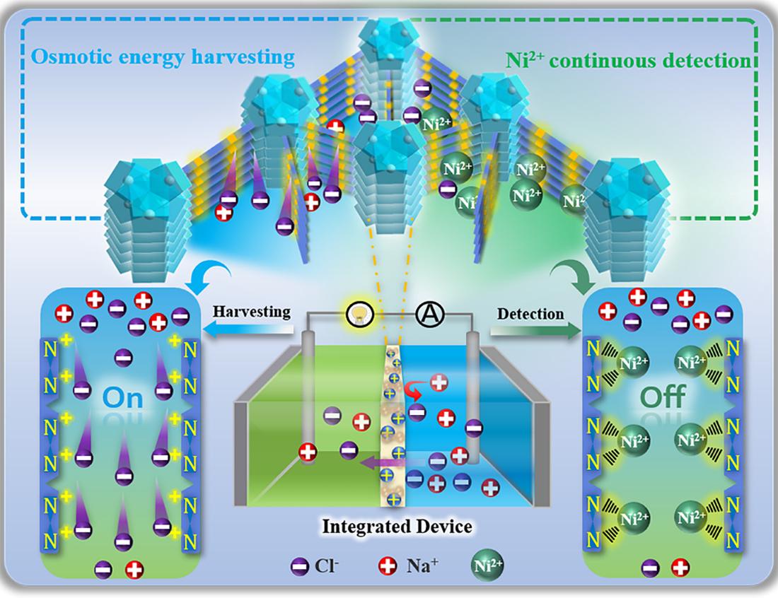 基于智能离子通道的多功能集成器件示意图,实现无机废水中盐差能高效收集和污染源实时在线监测。