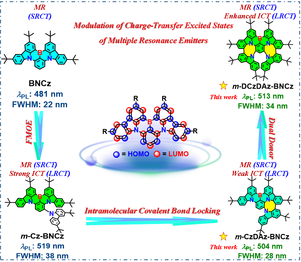 在窄带发射的MR-TADF材料的发展中,由于OLED行业对蓝光材料的迫切需求,蓝光在三原色发光材料中率先取得突破。然而,受限于对结构与性能关系的理解,长波长(> 500 nm)MR-TADF材料的发展相对滞后。事实上,高色纯度的红、绿、蓝有机发光材料对广色域OLED显示至关重要,同时也意味着实现完整的可见光谱覆盖具有挑战性。基于前线分子轨道工程(FMOE)策略(Angew. Chem. Int. Ed.2020,59,17442−17446;Angew. Chem. Int. Ed.2023,62, e202312451),王悦课题组于2020年成功开发了一种发射峰位超过520 nm的MR-TADF材料,m-Cz-BNCz;它巧妙地将母核BNCz的MR骨架(λPL: 481 nm,半峰宽(FWHM): 22 nm)与具有分子内电荷转移(ICT)态的给−受体(D−A)结构相结合,显著实现了光谱红移(λPL: 519 nm),并维持了一定的窄带发射(FWHM: 38 nm),为长波长MR-TADF材料的设计提供了重要指导。然而,进一步研究表明,m-Cz-BNCz融合了短程电荷转移(SRCT)以及扭曲D−A结构的长程电荷转移(LRCT),导致其FWHM过宽。事实上,FWHM与ICT强度存在“此消彼长”的关系。因此,如何在FMOE策略下实现光谱红移的同时尽可能保持窄的FWHM,以在这两种对立参数间找到平衡,仍是一个亟待解决的关键问题。