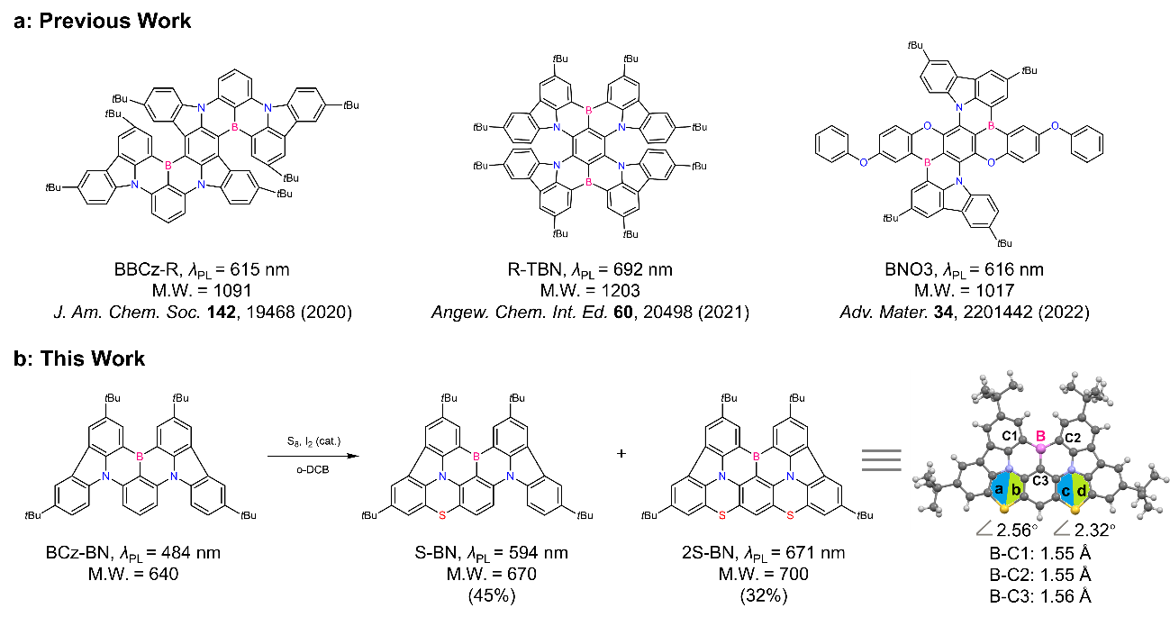 S-BN的合成方法简洁且高效。使用0.4当量的碘作为催化剂,将课题组前期报道的蓝绿光前驱体BCz-BN与硫单质直接反应,通过一步合成法成功获得了目标S-BN和2S-BN,产率分别为45%和32%。值得注意的是,这里没有使用钯或其他过渡金属催化剂,彰显了这种合成方法的经济效益。