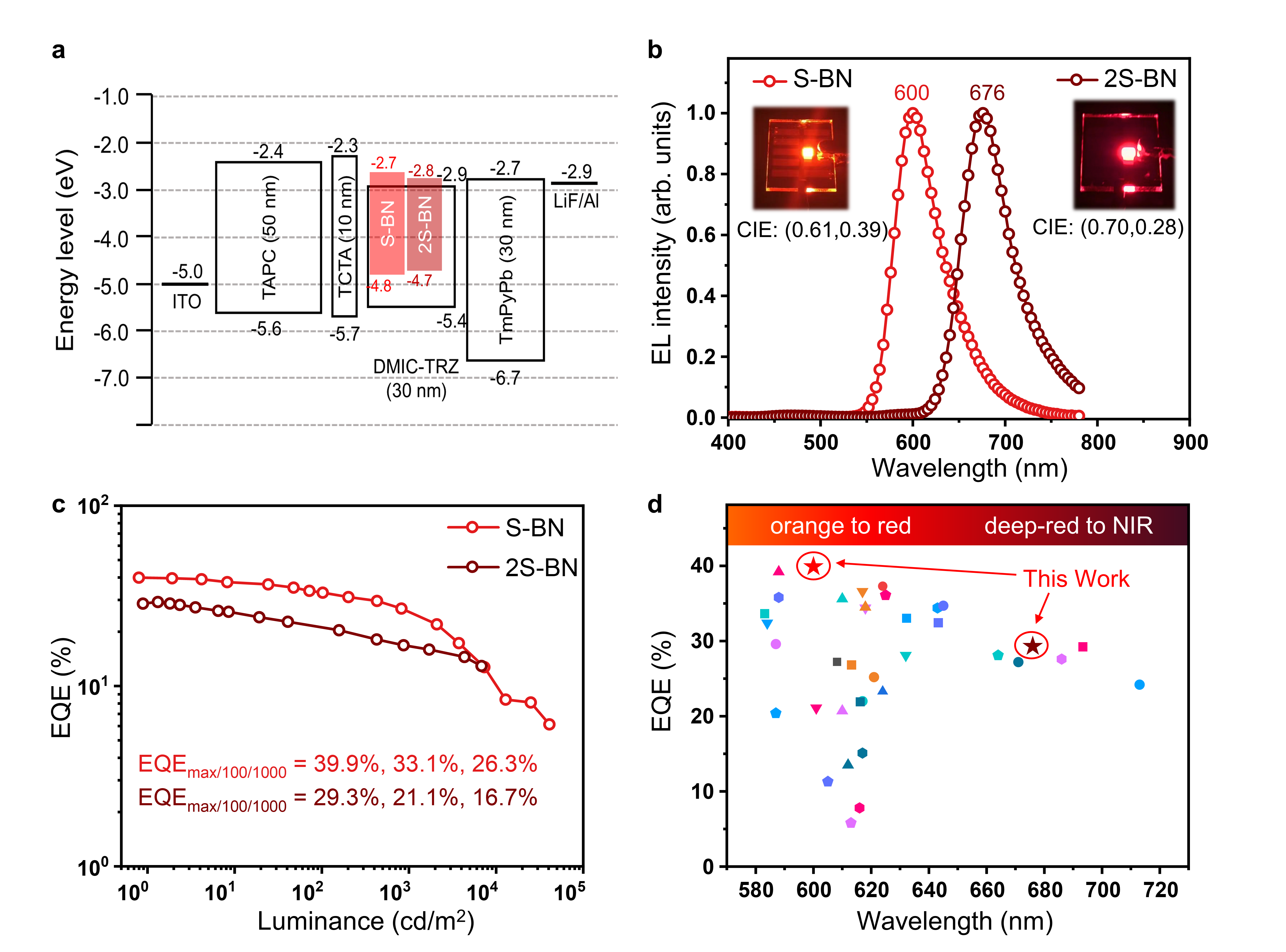 图3:基于S-BN和2S-BN的非敏化OLED的电致发光性能。a设备结构及相关材料的能量级对齐。b电致发光光谱。插图:设备的电致发光图像。c外部量子效率与亮度曲线。d代表性橙红色/深红色MR-OLED的外部量子效率与波长图。