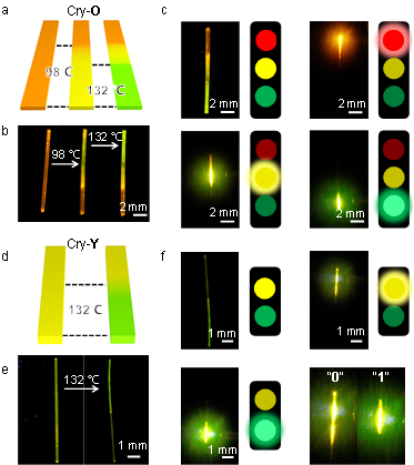 利用Cry-O和Cry-Y的单向不可逆相变过程,通过对原始晶体的不同部分进行选择性加热,设计了三元和二元伪异质结。对于Cry-O,在不同温度下选择性地加热不同区域(图3a),形成了一个伪异质结结构,在一个单晶中包含了三个不同的晶相。每个晶相在365 nm激发下发出独特的荧光波长(图3c)。通过刺激特定区域,可以选择性激活不同颜色的荧光,该特性允许基于对应于每个晶体相位的特征波长信号进行位置识别。对于Cry-Y,由于它从室温到熔化只经历了一个相变(图3d,e),相同的处理方法在单晶材料中产生二元伪异质结(图3f),每个对应于特定的荧光波长。这两个波长信号可以表示二进制状态“0”和“1”,允许对信号进行二进制加密传输(图3f)。