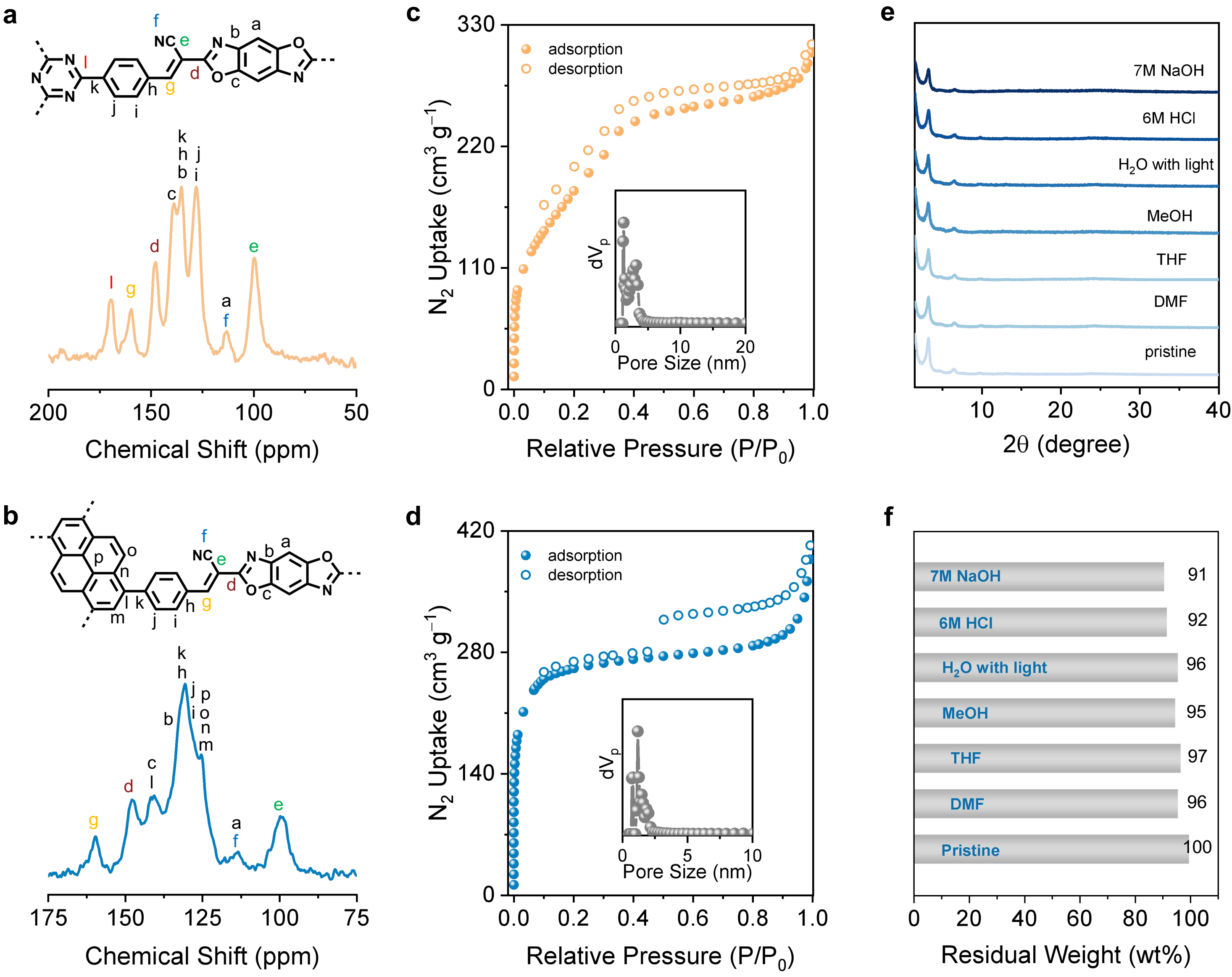 氮气吸附-脱附测试表明,COF-JLU45的BET比表面积为860 m2g-1,高于同类材料(如V-COF-2的627 m2g-1),且孔径分布集中于1.9 nm,与理论模型高度吻合。固体核磁(13C CP-MAS)与XPS谱图证实了氰基乙烯键的形成,在约159.5 ppm处观察到新生成的乙烯碳信号。红外光谱表明醛基特征峰(~2712.8 cm-1)显著减弱,表明单体成功聚合。稳定性测试结果证实了COF-JLU45具有优异的化学和光化学稳定性。