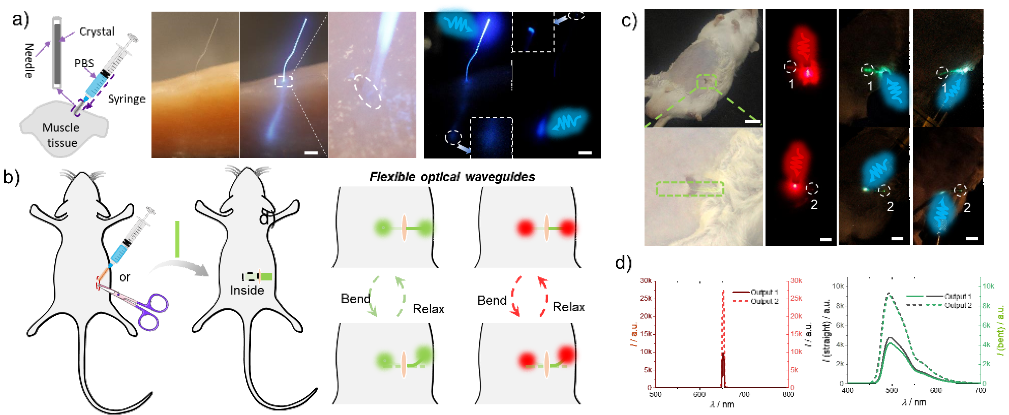 为实现柔性有机晶体在活体内的精准植入,本研究通过磷酸盐缓冲液(PBS)推动,成功将长约2 cm的晶体嵌入小鼠皮下深度达1.1 cm处,并确保有近1 mm的晶体部分悬露于皮外(图3a)。植入后,通过分别采用375 nm与654 nm光源激发,晶体不仅能在体内有效传输信号,还分别展现出主动发光(发射绿光)与被动传输(传递红光)的双重波导功能(图3b-d)。