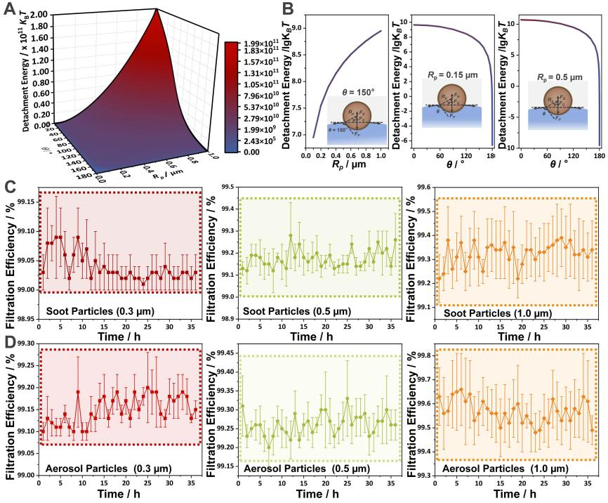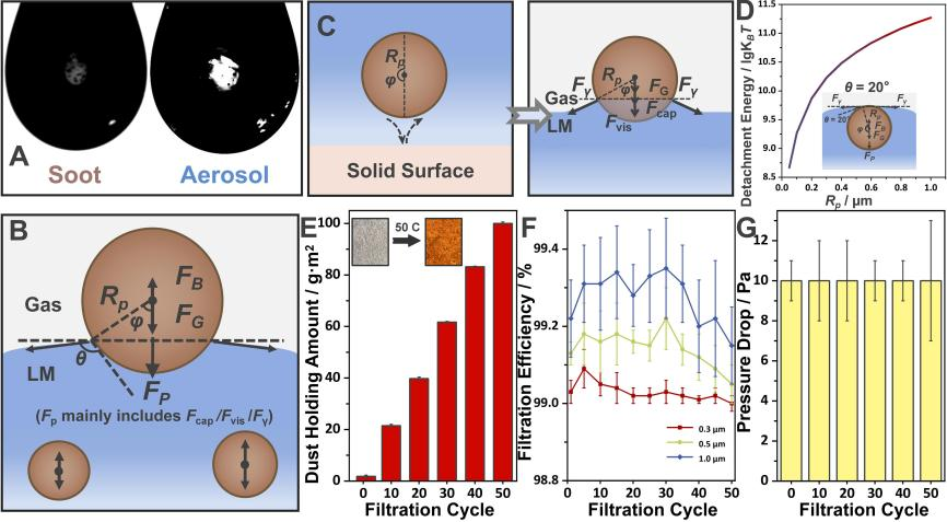 如图1A所示,LMS整体的过滤机制包含下述三个步骤:第一步骤是颗粒物与气-液界面之间的相互吸引效应。理想的功能液层能够为悬浮在空中的颗粒提供强大的吸引力。当受污染的空气吹向并靠近过滤器时,其中的颗粒物就会被集中吸引至液体表面。而第二步骤涉及到对颗粒的捕获。该步骤中的颗粒物的表面自由能变化表明,任何颗粒物从气相到气液界面的附着行为均能够自发发生。在第三步骤中,功能液层能够进一步实现对被捕获颗粒物的截留与浸没。浸入功能液层中的颗粒物所受到的总捕获力(FP)协同其所需的超高颗粒脱离能(颗粒物脱离液层返回气相所需要的能量)足以保证被捕获的颗粒能够在液层内留存下来。换句话说,功能液层作为核心的捕获介质能够“拖拽”颗粒物进入液层内部,并且同时阻止被捕获的颗粒物逃逸返回气相。LMS能够实现对几乎所有种类的空气内悬浮颗粒物(无论其润湿性和表面形态)的有效捕获。