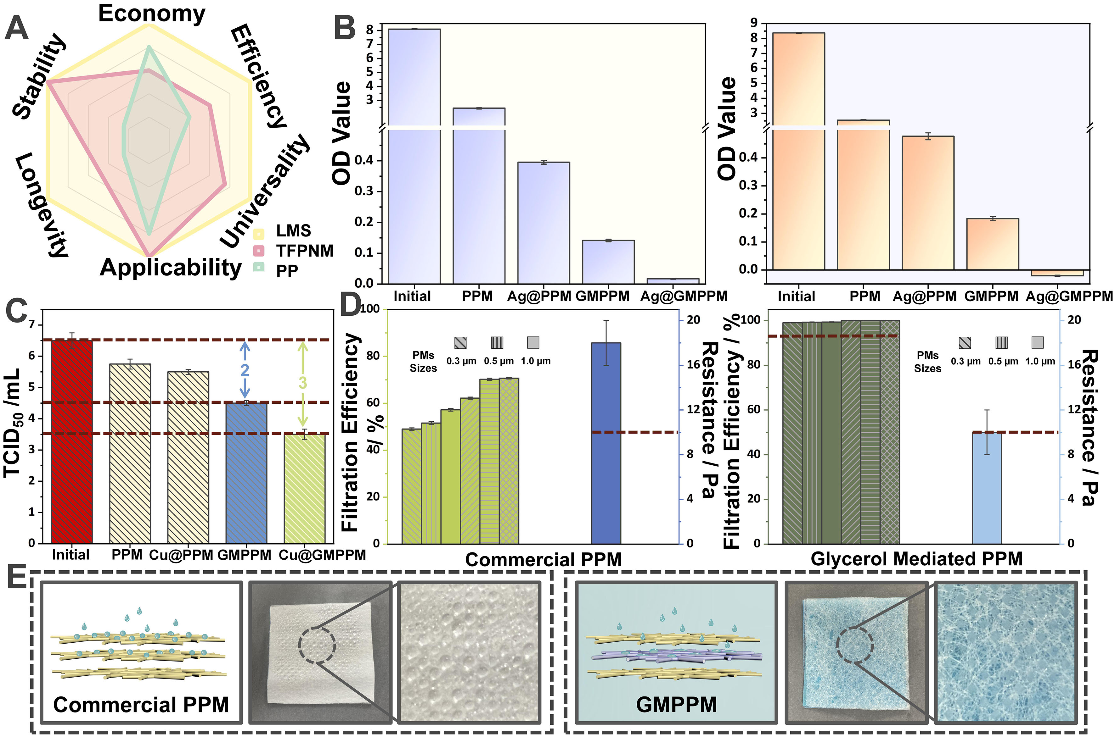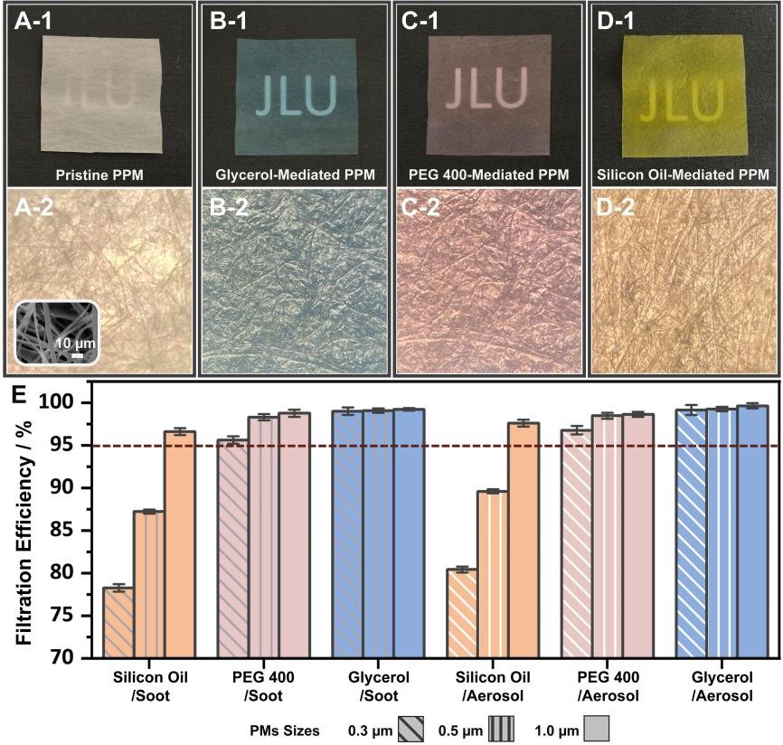 该研究重点开发了以丙三醇液体层作为核心液体介质的LMS(命名为GMPPM),通过采用一种连续卷对卷生产方法(图1B)实现了单根纤维基质上形成超薄的液态外壳层。这种“核壳”结构的GMPPM(其中甘油作为外壳部分,纤维基质作为核部分)能够保持过滤器固有的高孔隙率,以提供一条通畅的空气通道从而避免高压力降数值的产生。这一独特的液态-多孔膜基质结构打破了传统液膜由于液体引入造成的孔隙堵塞缺陷。