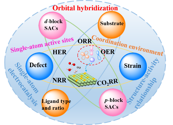 目前,单原子催化剂(SACs)的结构-活性关系主要通过计算不同电位下反应路径的自由能变化、中间体的吸附自由能以及各基元反应的能垒分析。或者,依据d轨道理论对d区单原子催化剂的结构-活性关系进行分析。事实上,轨道杂化决定着单原子催化剂电催化活性,而自由能只是轨道杂化导致的宏观结果。然而,并非所有单原子催化剂的结构-活性关系是从轨道杂化角度展开分析的。迄今为止,关于单原子电催化中的轨道杂化的总结以深入理解微观层面的结构-活性关系以及为构建高性能单原子电催化剂提供有价值且可靠的指导方针是非常缺乏的。