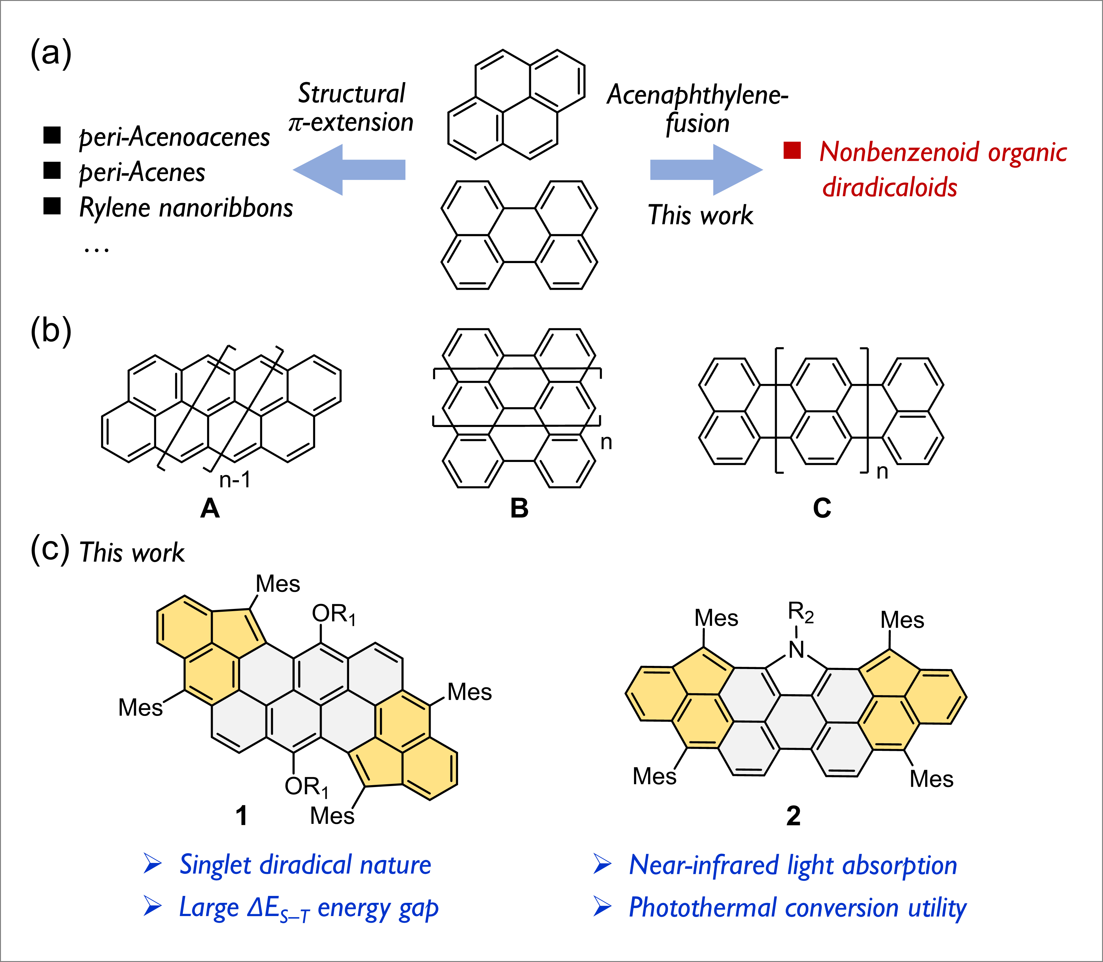 图1.苯型稠环和非苯稠环双自由基的(a)设计策略及(b,c)化学结构