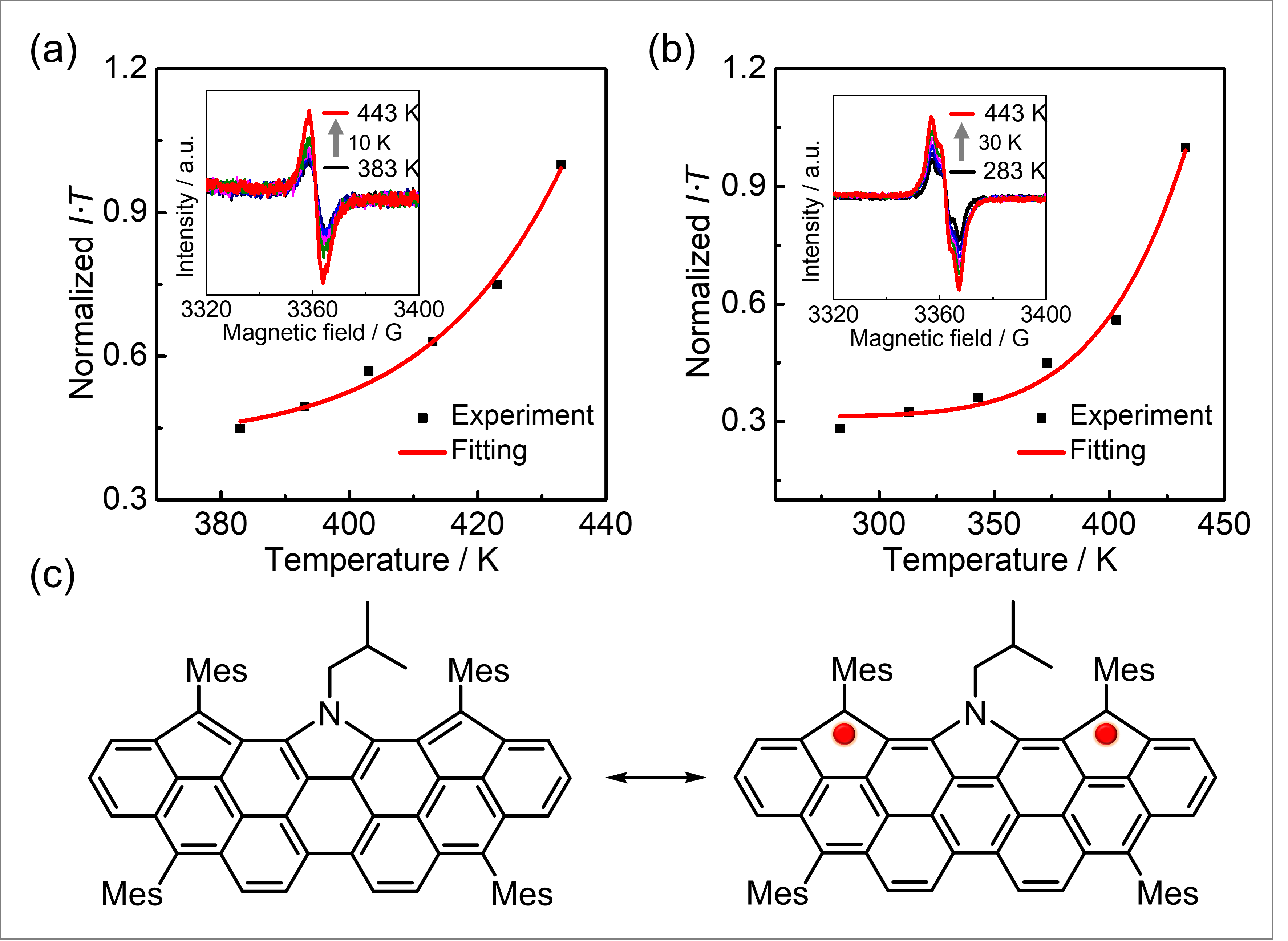 图2.(a,b)1和2的变温电子顺磁共振谱;(c)2的闭壳/开壳共振式