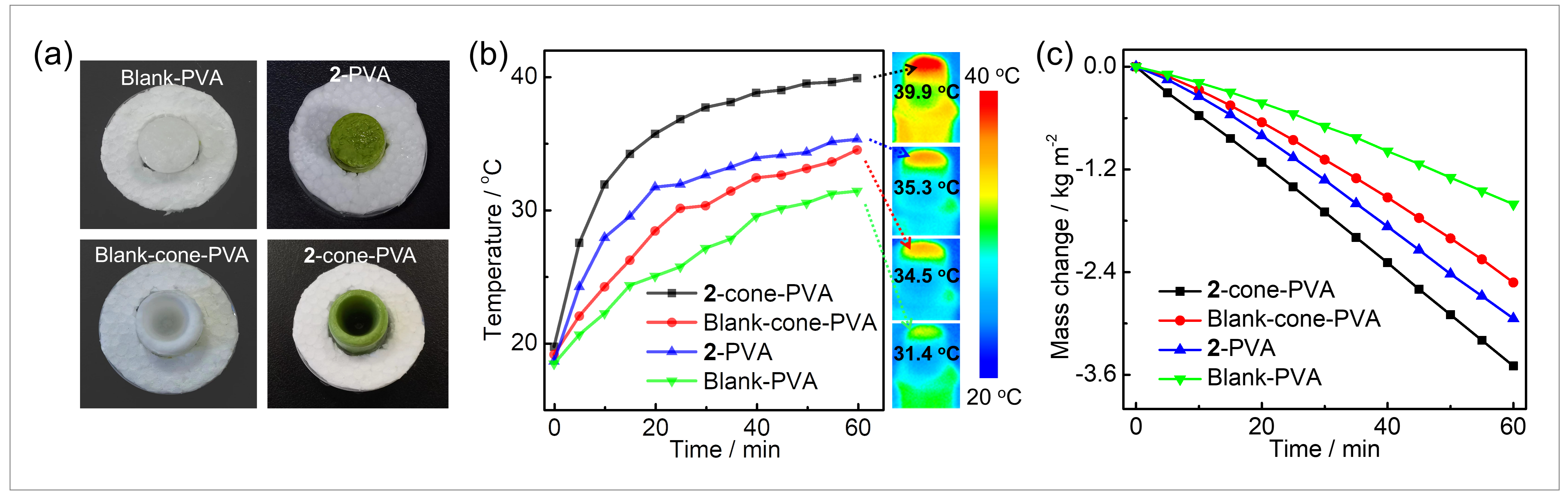 图3.三维太阳能蒸发器的(a)数码图片,(b)表面温度变化和(c)蒸发水曲线